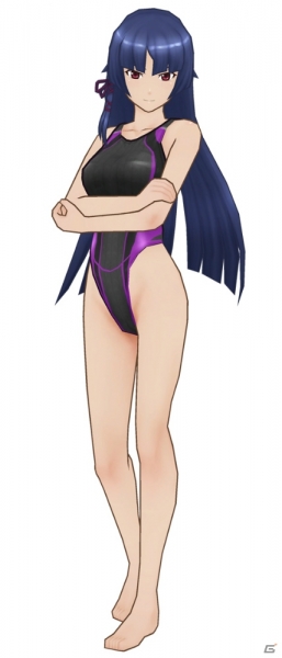 「志遠」をイメージした水着のセット。黒と紫の大人びたワンピースタイプの水着が、「志遠」の魅力をより一層引き立てる。