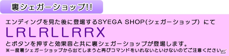 本日配信された更新データを適用すると、ゲーム内に登場する「シェガーショップ」にて、LRLRLLRRXと押すと「裏シェガーショップ」が登場するようになる。