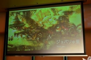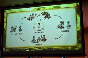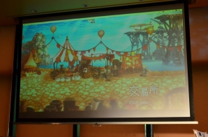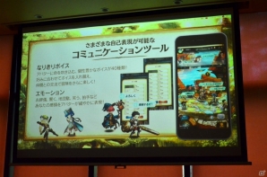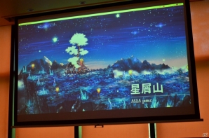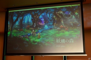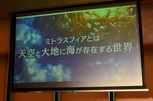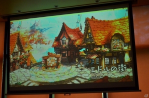 空と大地に海が存在するというファンタジーな世界が、どこか懐かしい2Dグラフィックで絵本風に描かれる「ミトラスフィア」。清水氏は、プレイヤーたちが集う交易所をはじめ、森や街など、“遊んでいるだけで癒される”フィールドの数々を紹介。壮大な世界観を表現するグラフィックの出来栄えに自信をのぞかせた。