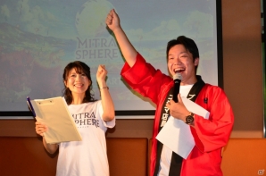 コジマ店員さんと間宮祐子さんの司会で幕を明けた「『ミトラスフィア』リリース直前ミーティング~重大発表!なのじゃ~」。冒頭、プロデューサーの清水啓之氏より「ミトラスフィア」に関するプレゼンテーションが行われた。