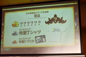 続いて、「引き運最強メディア決定戦」が開催。この企画では、ゲーム内のミトラシリーズガチャ(単発)を引き、高レアリティの装備を引いたメディアに、「特製Tシャツ」、「特製Vプリカ」、そして「マスタークラウン」が贈られた。
