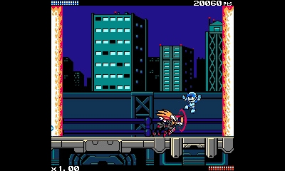 本製品は、「蒼き雷霆 ガンヴォルト」本編とは一味違い、グラフィック的にも操作感覚的にも懐かしさが感じられる横スクロールアクションゲームになっている。十字ボタン+2ボタン(ジャンプ&ショット)というシンプルなアクションを中心に遊びが構築されており、初めてプレイする人でも、すぐに馴染める王道のアクションゲームだ。