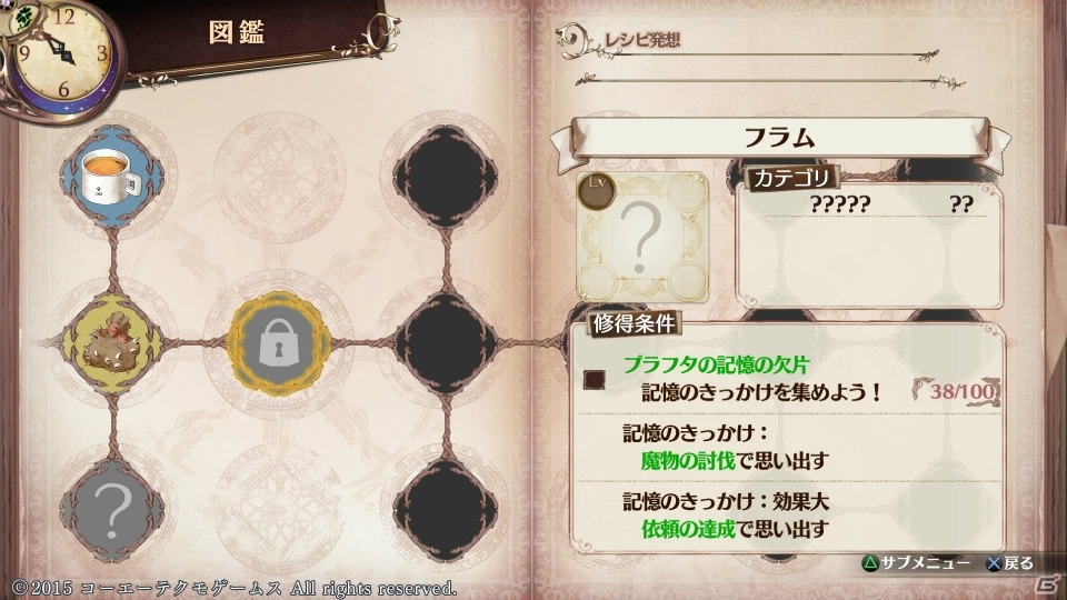 レシピ発想はチャート型になっていて、プラフタの記憶を取り戻すキーになっているレシピにはロックが掛かっています。修得条件をたっせいすることで、レシピを発想して調合できるようになります。基本的には全てのレシピは条件がわかりやすくまとまっているので、躓くようなことはないと思います。