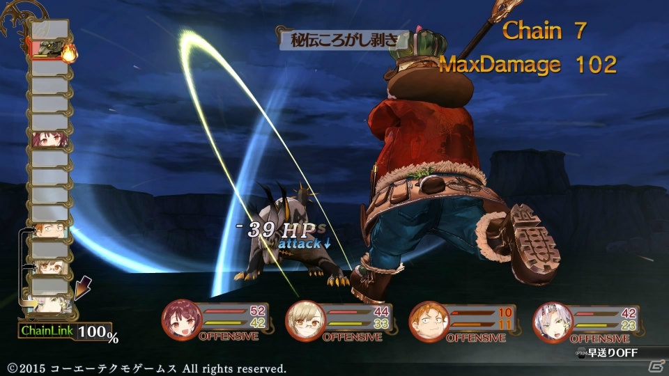 さて、先ほどから触れている通り、採取地には魔物がウヨウヨしています。ソフィーたちの経験値を得ることも当然ながら、魔物を倒すことでも材料が手に入れることができますので、積極的に倒していきたいところです。そのバトルですが、黄昏シリーズにおけるコストターンバトルから、今作ではロジカルターンバトルとして刷新されています。