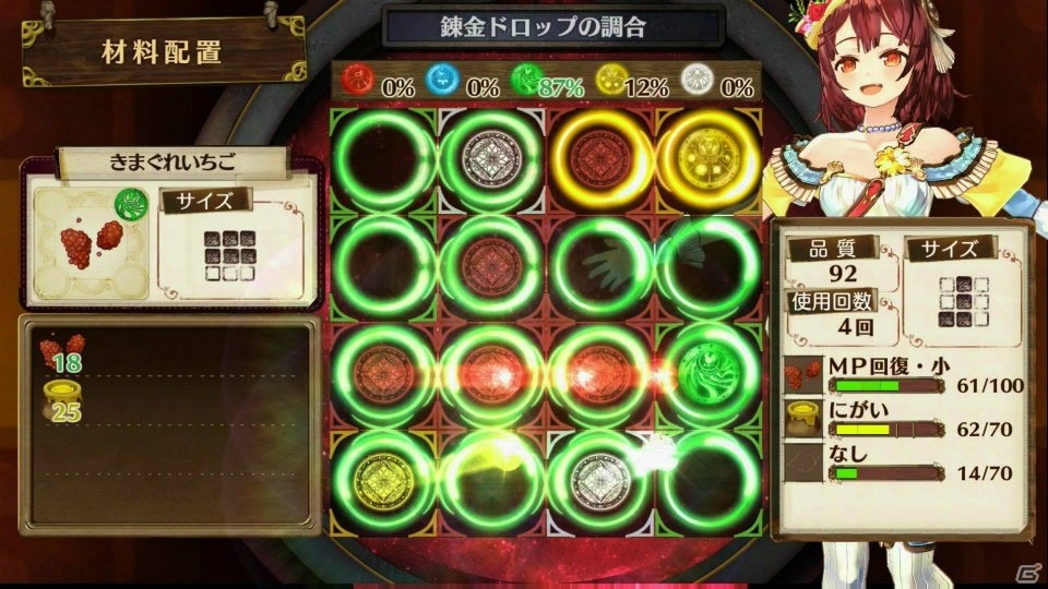 大前提として材料の吟味をするというのは今までと変わらないのですが、その上でどうやってマスを埋めるかによって結果が変わるということで、感覚的になっていると思います。あとボーナスがつくのは同じ属性の効果を使った部分だけなので、例えば青いところを多く埋めていけば、青属性の効果が大きく変わっていきます。
