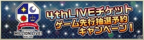 バンダイナムコエンターテインメントは、GREEにてサービス中の「アイドルマスター ミリオンライブ!」において、本日12月1日より「THE IDOLM@STER MILLION LIVE! 4thLIVE TH@NK YOU for SMILE!!」のチケット先行抽選予約キャンペーンを開始した。