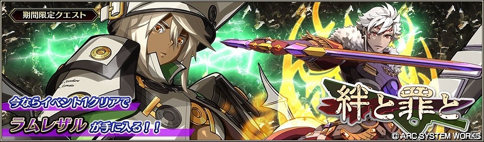 「ギルティギア」キャラクターと繰り広げるストーリー付きのイベントクエストを開催!ステージ 1をクリアするとコラボレーション限定ユニット「ラムレザル(★6)」が必ず獲得できます!また、イベントクエストの進行やラムレザルの成長にあわせてパネルミッション達成による豪華な報酬を得ることもできます。各ステージの戦利品やクエストミッション、およびイベントミッションでは「ラムレザルの魂片」や「ラムレザルの記憶片」を獲得して、獲得したラムレザルを期間中に最大強化してみましょう!