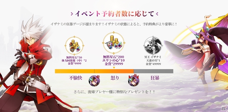 コラボイベントに合わせ、現在特別なコラボ予約イベントが開催中!イベント予約者数に応じて、イベントボスイザナミの狂暴ゲージが溜まります!イザナミの状態によると、予約特典がより豪華に!さらに、復帰プレイヤー様に特別なプレゼントを用意しました!皆様、このチャンスをつかみましょう!