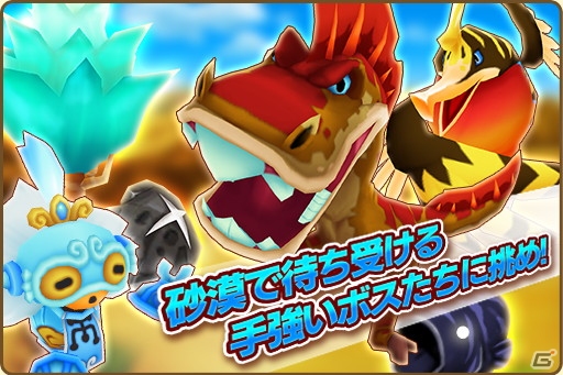 新たなる敵が待ち受ける、待望の新フィールド「サンサン砂漠」が解放されました! 広大な砂漠を駆け回る新たな冒険の始まりです(※サンサン砂漠はメインストーリー5章クリア後に解放されます)。サンサン砂漠で手に入る新たな素材で作る新レシピも!