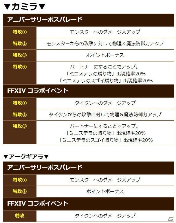 ★5キャラ「カミラ」、新★5弓「アークギアラ」は、今回のイベント「アニバーサリーボスパレード」、さらにはファイナルファンタジーXIVコラボイベント「タイタン討伐戦」「真タイタン討滅戦」において有利になる特効つき!
