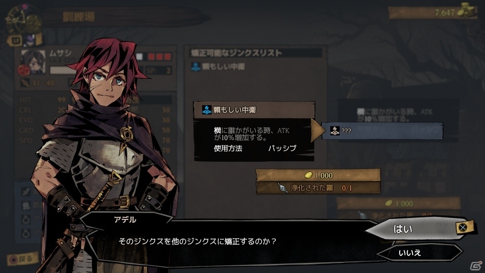 キャラクターは成長する時に「ジンクス」と呼ばれる能力を入手します。ジンクスは必ずしも、良い効果が得られるとは限りません。ジンクスを変えたい場合は、ダンジョンで入手できる「浄化された霧」というアイテムを使い、「ジンクス矯正訓練」を受けることで、何か別のジンクスに矯正することができます。