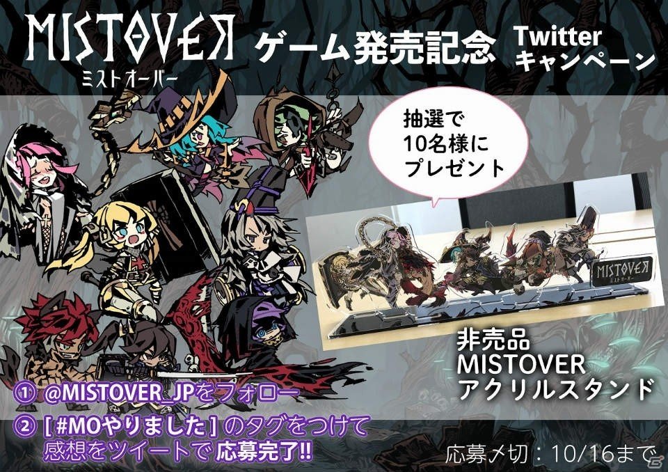 「MISTOVER」公式Twitterアカウント(https://twitter.com/MISTOVER_JP)をフォローして【#MOやりました】のタグをつけてゲームの感想をツイートすると、抽選で10名様に“非売品 MISTOVERアクリルスタンド”をプレゼントします。