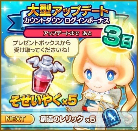 「大型アップデートVer1.5」まで、あと3日!!毎日その日だけもらえる“カウトダウンログインボーナス”を実施中