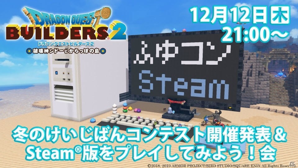 また、公式番組「『ドラゴンクエストビルダーズ2』冬のけいじばんコンテスト開催発表&Steam版をプレイしてみよう!会」が12月12日(木)21:00から放送されることも発表となっている。