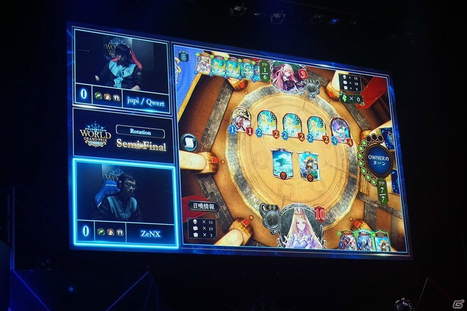 ソニックシティホールを大勢の「Shadowverse」ファンが埋め尽くす中、準決勝へ進出したのはsasamumu選手、yoyo選手、ZeNX選手、jupi / Qwert選手の4人。ここでは、準決勝以降の試合をレポートする。