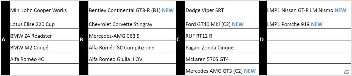 ギア・クラブ アンリミテッド2収録車の中から13台がサーキット仕様で登場。「耐久選手権」のために追加された新車は5台。うちLMPを冠するカテゴリDの2車種はル・マン 24時間の参加車両として独自に規定された競技専用車「ル・マン プロトタイプ」となっている。