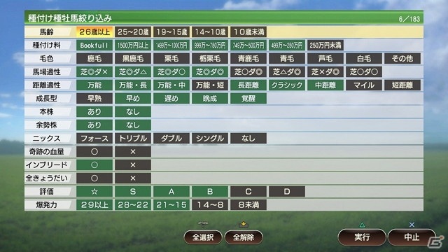種付けで種牡馬を選ぶときに、様々な条件のフィルタを設定して、種付け候補の種牡馬を絞り込む機能を追加しました。配合評価と爆発力を重視して大物誕生を狙う正統派の配合はもちろん、インブリード(全きょうだいインブリード)やニックスの有無、馬場適性や距離適性など、プレイヤーの意図にあった種牡馬を絞り込むことで、より快適に種付けを楽しめるようになります。