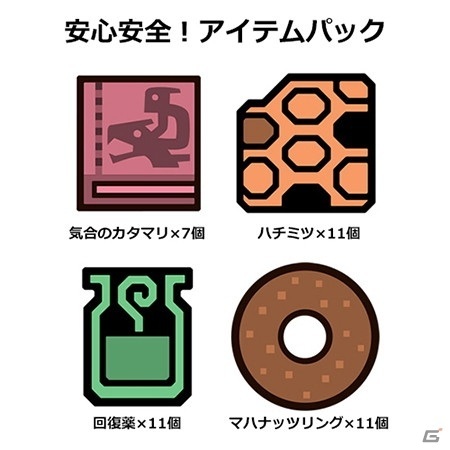 ゲーム序盤に役立つ「安心安全! アイテムパック」(気合のカタマリ×7個、 ハチミツ×11個、 回復薬×11個、 マハナッツリング×11個)