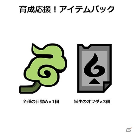オトモンの育成に役立つ「育成応援! アイテムパック」(全種の目覚め×1個、 誕生のオフダ×3個)