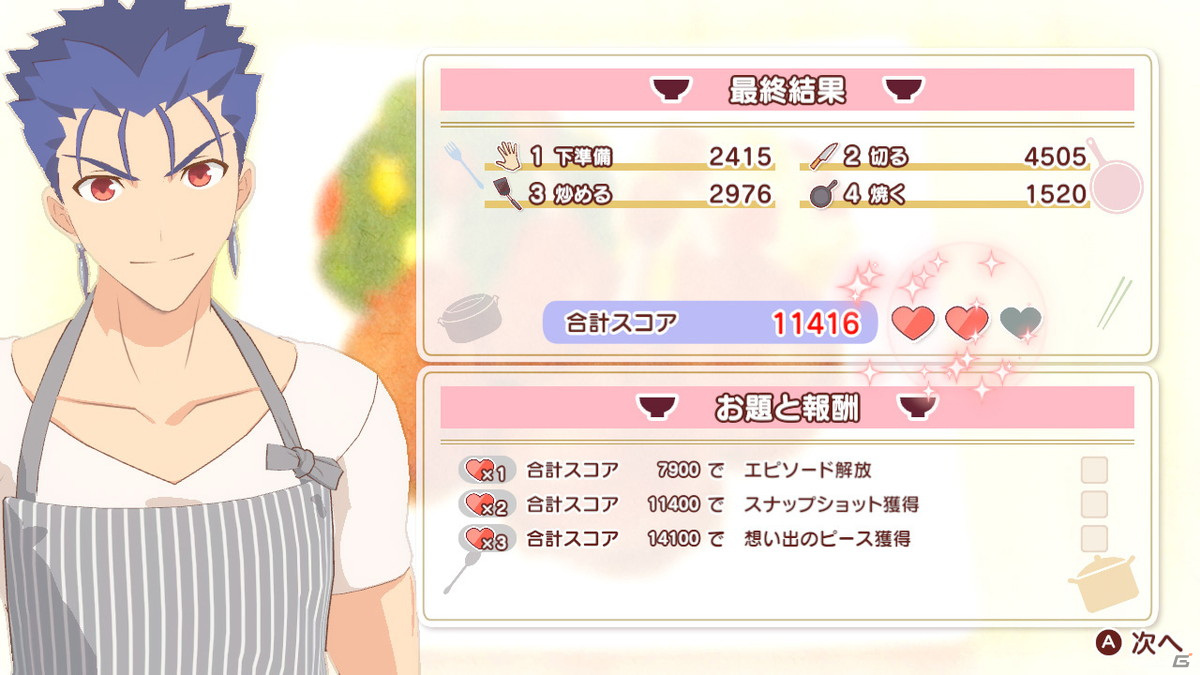 今回の追加コンテンツでは、本編に登場するセイバー、桜、凛と同様にランサー(CV:神奈延年)が料理に挑戦。ランサーが作った料理を、士郎やセイバーたちと一緒に食べてみるなど、さらににぎやかになったストーリーが楽しめる。