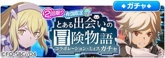 上記設置期間中、「2回限り有償限定とある出会いの冒険物語ガチャ」を設置しております。本ガチャはコラボ限定キャラとして★3バトルキャラクター「【未完の少年】ベル・クラネル」、「【剣姫】アイズ・ヴァレンシュタイン」、「【女神姿の売り子】佐天 涙子」や★3アシストキャラクター「【艶やかなる妖術師】サンジョウノ・春姫」、「【疾風】リュー・リオン」の提供割合がアップしております。