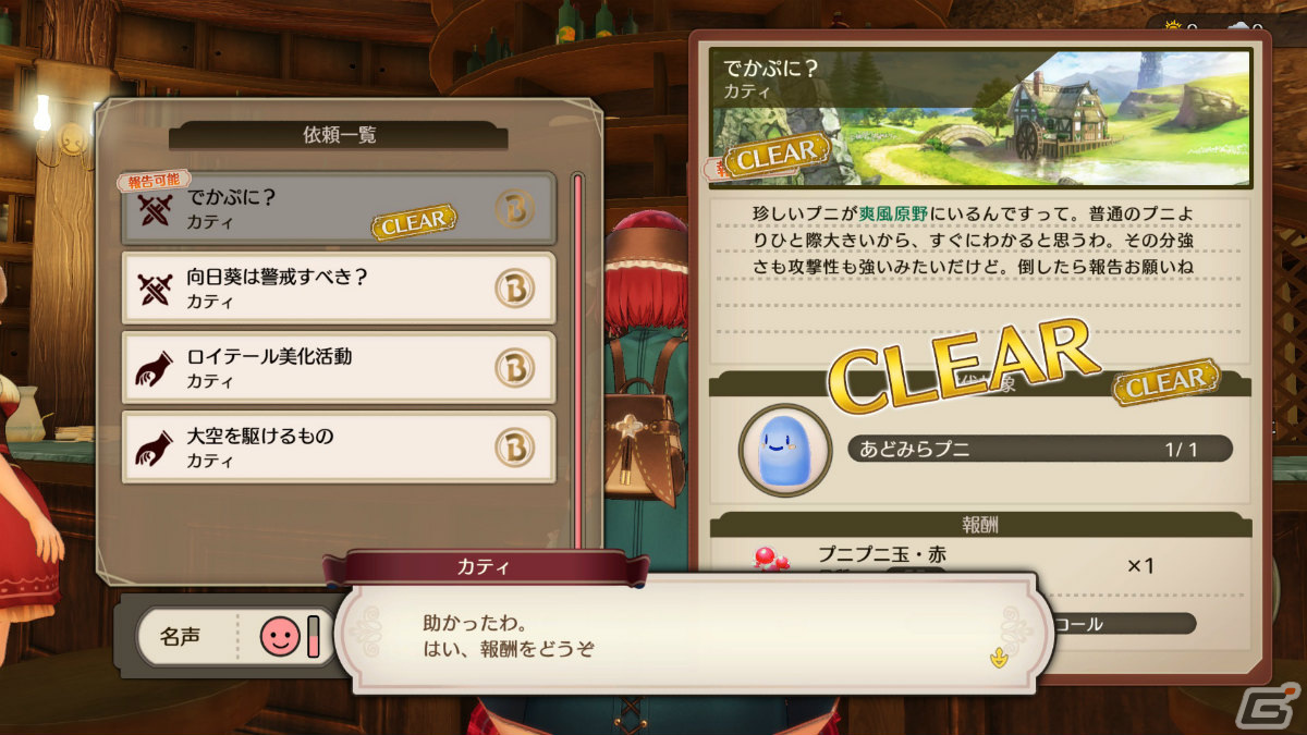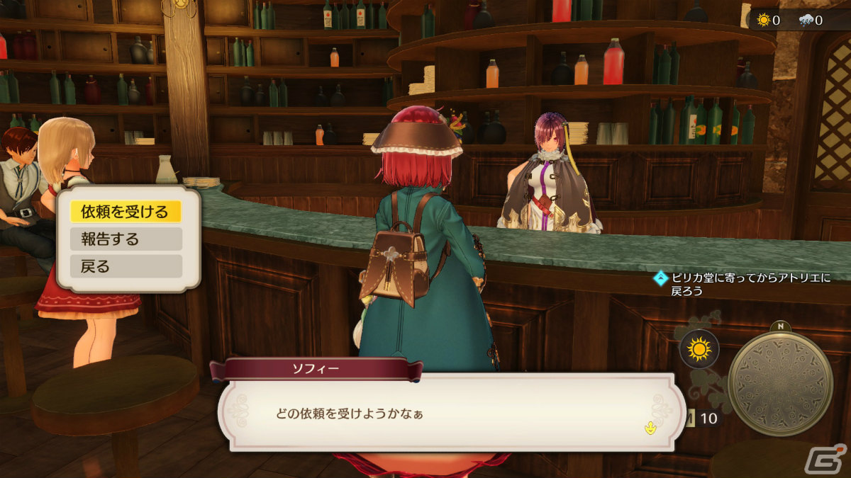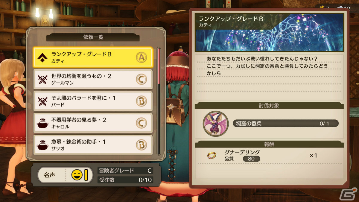 カティとノームが営む「水晶の輝き亭」では、町の人から寄せられる依頼を受注することができる。達成した依頼を報告すると、報酬が獲得できるほかソフィーの名声が上昇。冒険者グレードが上がる昇格依頼を受注できるようになる。冒険者グレードが上がれば、より難しい依頼をカティから紹介してもらえる。