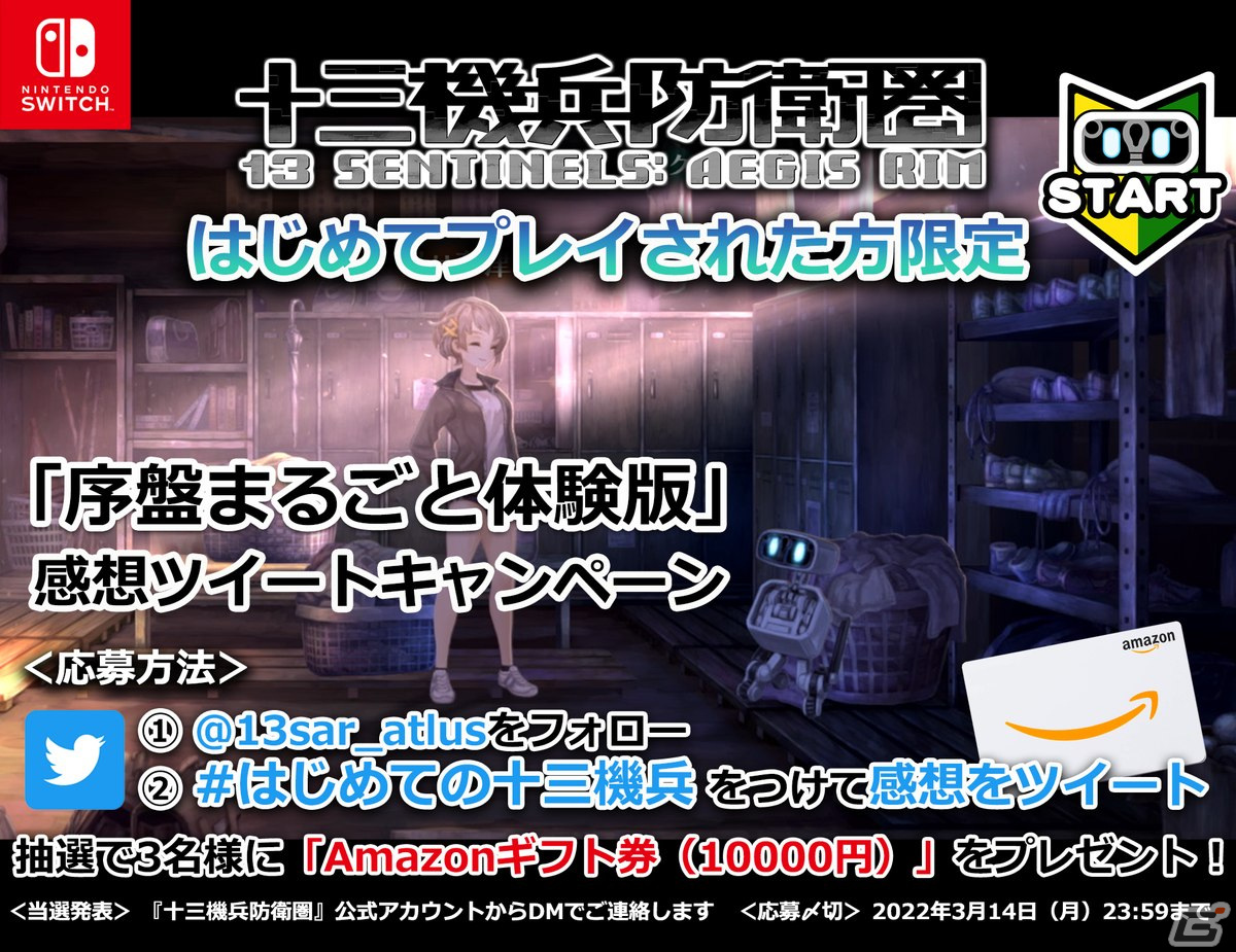 今回のキャンペーンは、「十三機兵防衛圏」を初めてプレイする人限定のキャンペーンとなっており、「序盤まるごと体験版」をプレイした感想を「#はじめての十三機兵」をつけてツイートした人の中から抽選で3名に「Amazonギフト券(10,000円)」が当たるというものになっている。