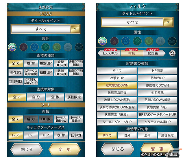 パーティ編成画面では、バトル画面と同様に攻撃順の表示を追加しました。また、検索メニューを細かくリニューアルした事で、パーティ編成したいキャラクターをより検索しやすくなりました!