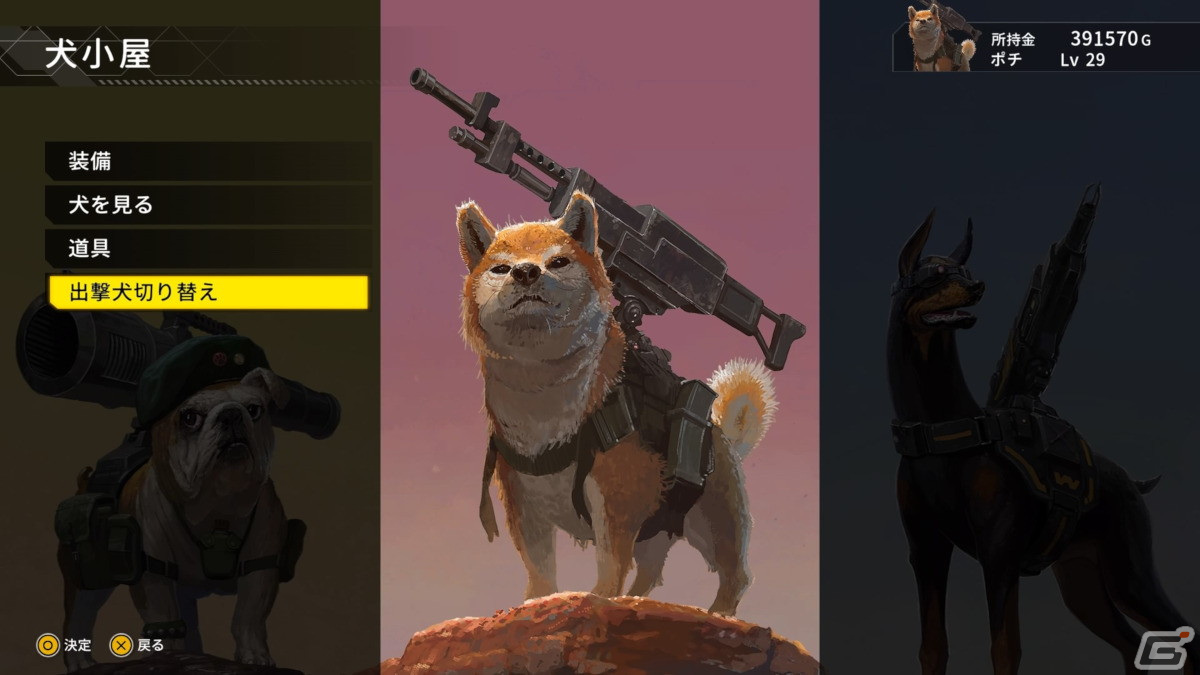 ミッションをクリアするたび拠点に戻り、次の出撃の準備をすることになる本作。ここでの準備も、「戦闘犬の装備を強化→ミッションで実戦投入」というサイクルの楽しさに寄与している。