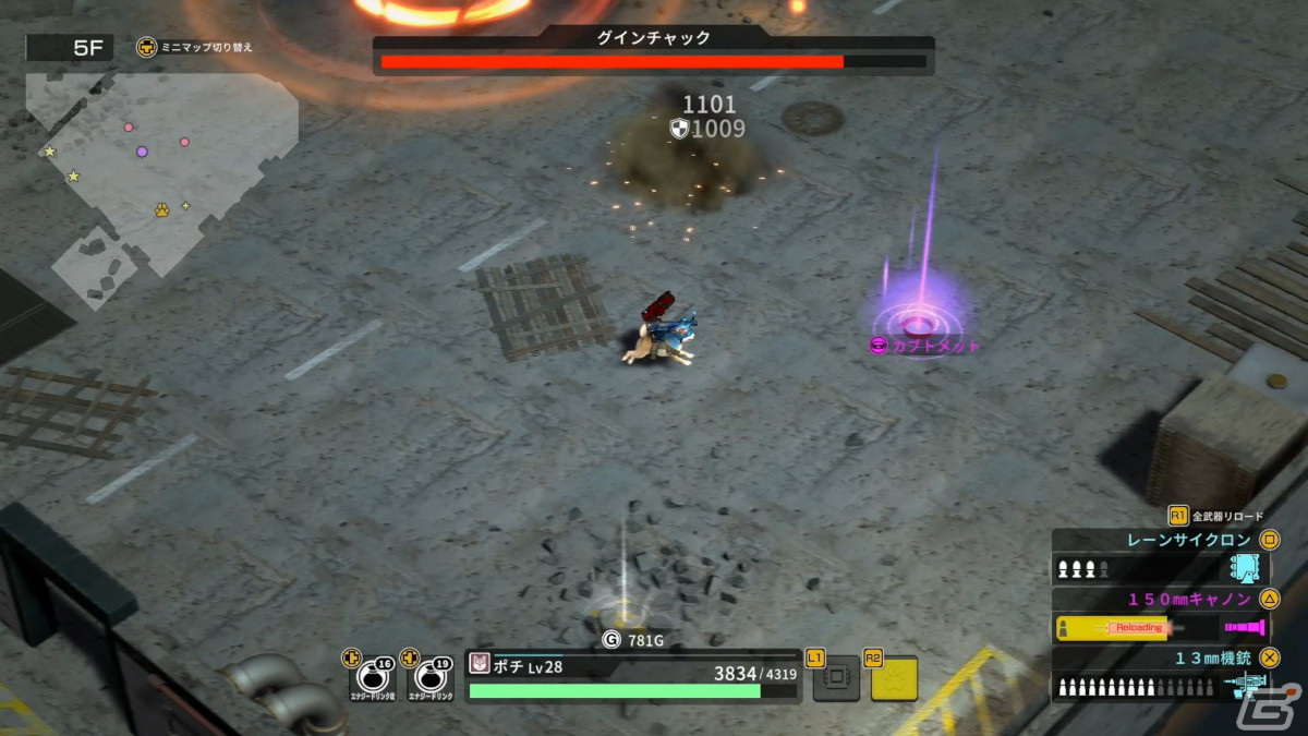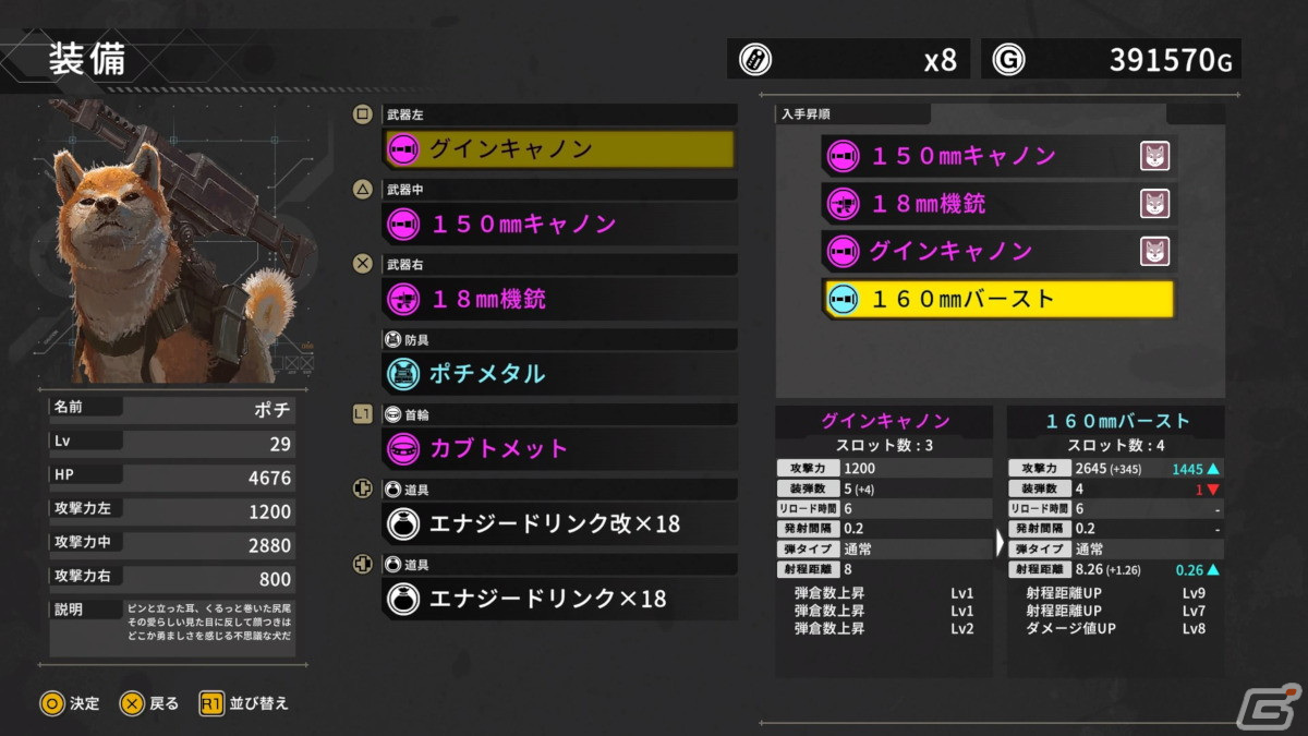 それぞれの戦闘犬は3つの銃火器、それから“防具”と「ラッシュ」(ゲージがMAXのときに発動する大技。詳しくは後述)の性能を決定づける“首輪”を装着・換装可能。これらにHP・状態異常回復などの効果を持つ消費アイテムのショートカットを2つ、合計で7つのスロットを付け替えて、カスタマイズしていく。