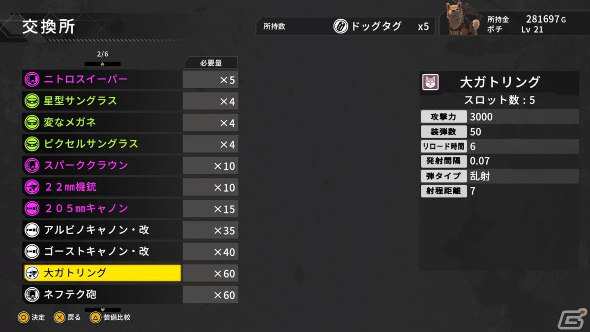 先ほどショップで販売している武器は滅多に使わないと書いたが、ショップにはミッション攻略中、低確率でドロップする「ドッグタグ」を複数集めることで非常に強力な武器と交換できる「交換所」という機能もある。ここで最強クラスの武器を手に入れるためには、かなりのやり込みと運を必要とする。本作のエンドコンテンツのひとつと言えるだろう。