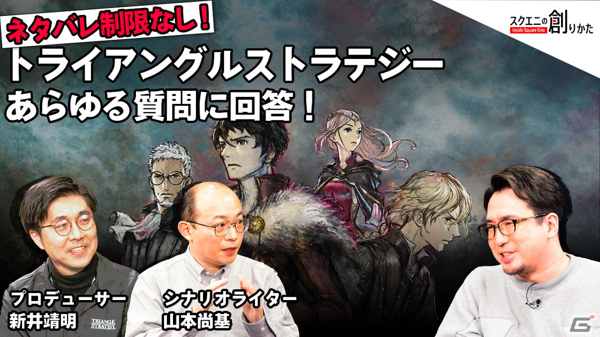 この番組は、声優の安元洋貴さんがスクウェア・エニックスのタイトルについて、クリエイターに直接開発過程のエピソードを聞いていく動画番組。今回は「トライアングルストラテジー」のプロデューサー新井靖明氏とシナリオライターの山本尚基氏を迎えて、マルチシナリオとなる今作における「Benefit」「Moral」「Freedom」という3つの価値観に基づいた「信念」によるストーリーの分岐、その複雑なストーリー制作におけるこだわりや苦労した点など作品に込めた意図を聞いている。