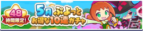 セガは、iOS/Android向けアプリ「ぷよぷよ!!クエスト」において、本日5月24日より48時間限定のお得な「5月ぷよっとお得な10連ガチャ」を開始した。