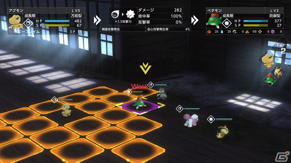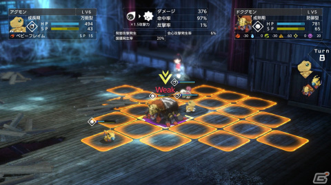 攻撃範囲や射程距離は技により異なる。側面攻撃や背面攻撃などの方向要素や高低差、モンスターの種族(データ・ウィルス・ワクチン)の相性、攻撃属性(炎、水、風、土、光、闇)の相性でダメージ量は変化する。