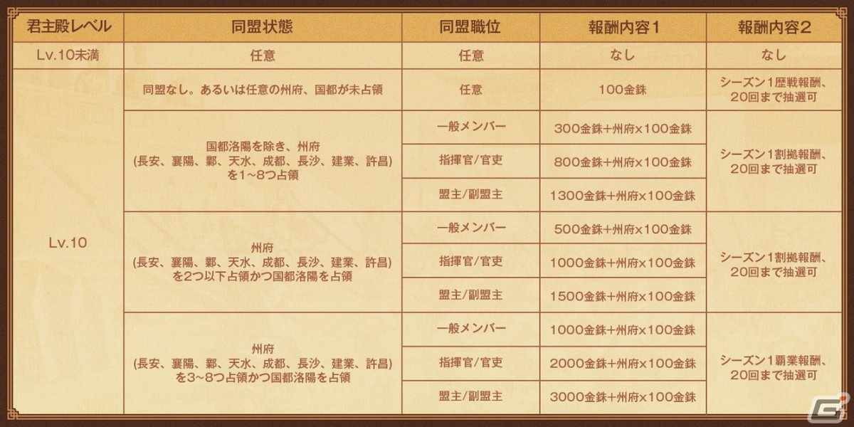 Lv.5~Lv.6拠点:参加者は一定の確率で中級、高級または飛熊軍財宝を獲得し、貢献が1位のプレイヤーは追加で金銖×30を獲得できます。