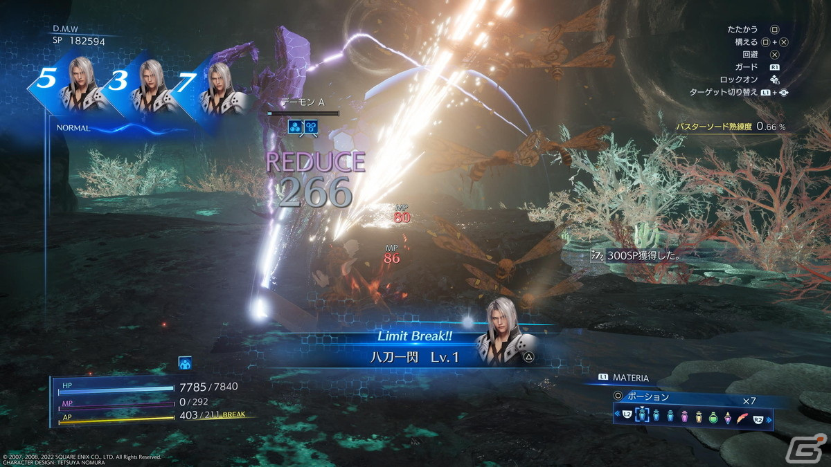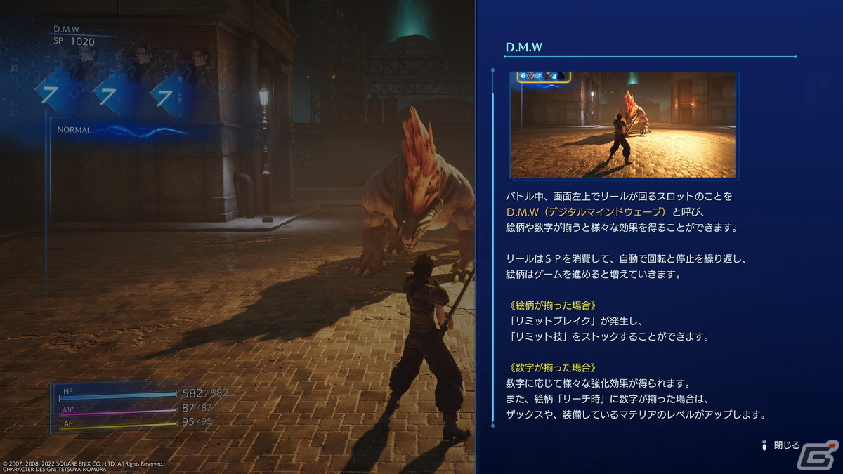 戦闘中に画面左上の3つのリールが回転し、揃った目によって様々な効果が現れるデジタル・マインド・ウェーブ(D.M.W)も、「CCFFVII」ではリーチの演出等が少々プレイ感を阻害してしまう部分もあったが、本作ではアクションの邪魔を一切することなくD.M.Wが作用するようになっており、プレイの快適性が増している。