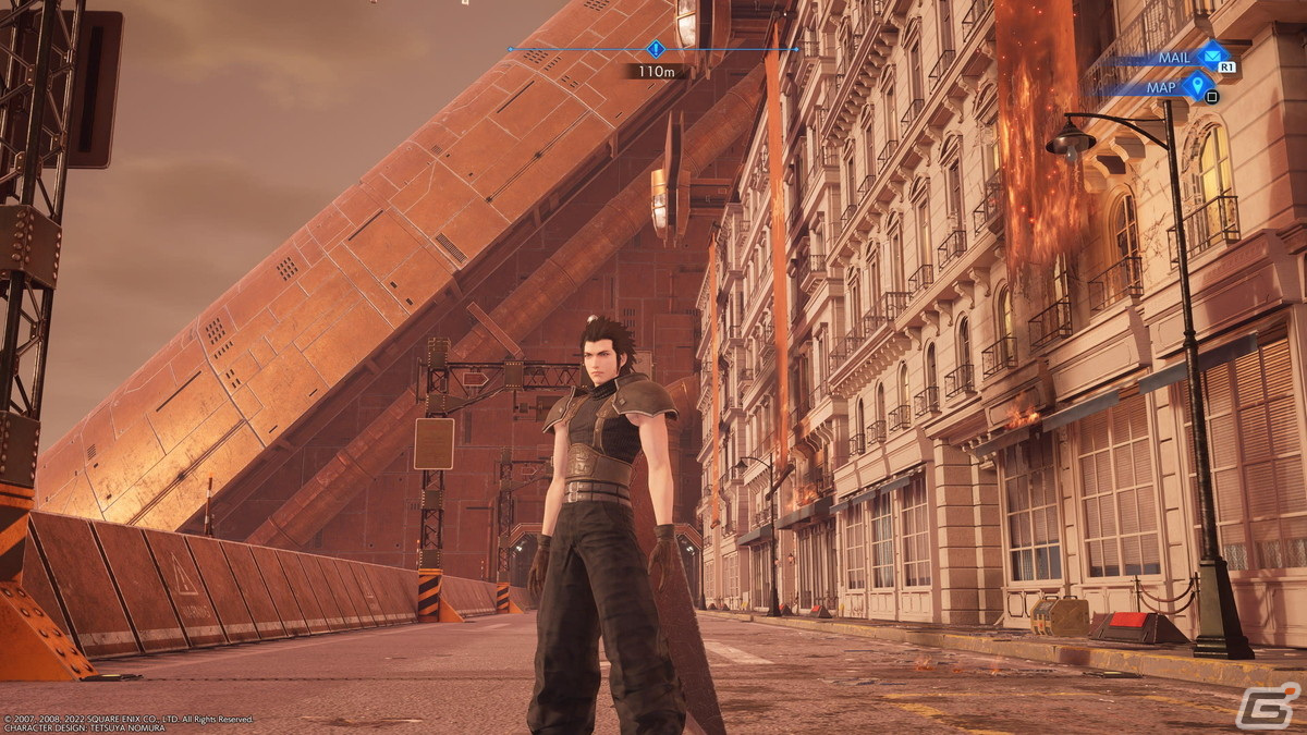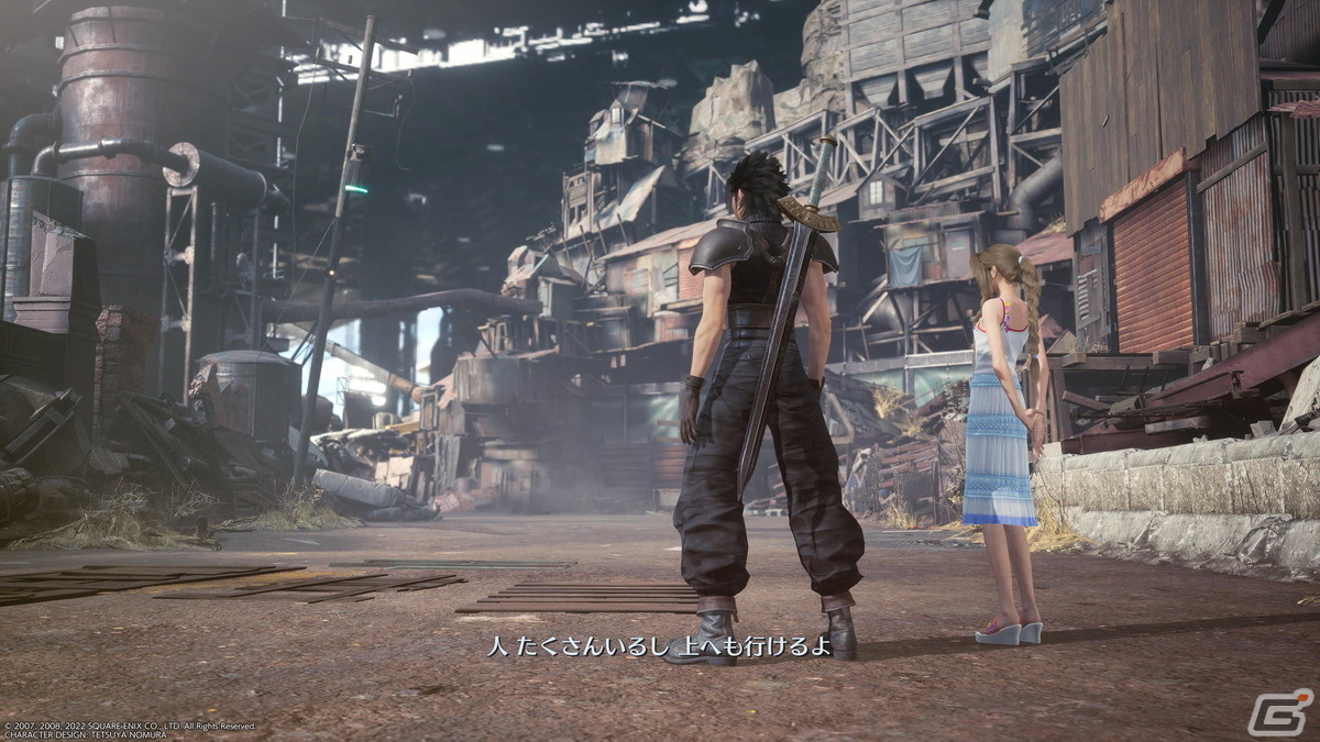 筆者が特に印象的だったのは、ザックスが伍番街スラムに落ちてきて、そこからエアリスと共に外を歩いた時に上空を仰いだミッドガルの景色だ。この景色は、「FFVII リメイク」の七番街スラムで初めて朝を迎えてミッドガルの下層から上層を見上げたあの時の衝撃に近いものがあった。むしろほぼ”そのまま”だった。