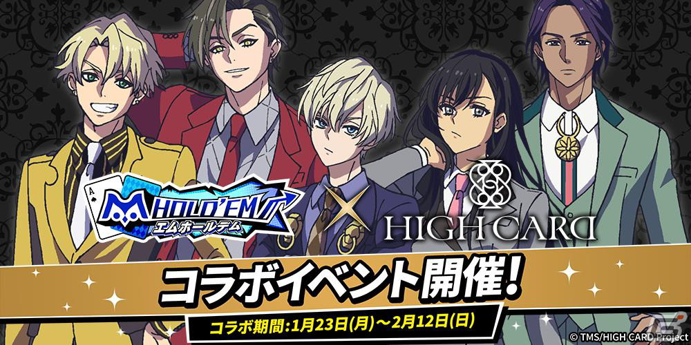 サミーは、iOS/Android向けアプリ「m HOLD’EM」において、アニメ「HIGH CARD」との第二弾コラボレーションイベントを1月23日から2月12日まで開催する。