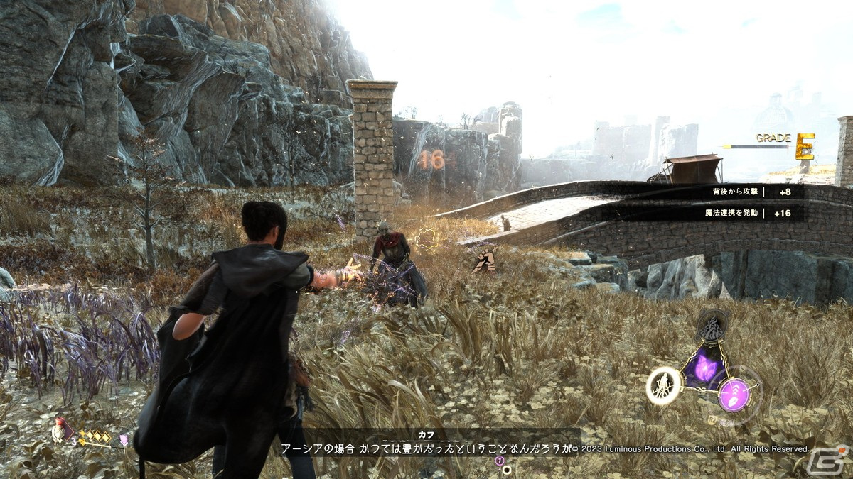 本作のバトルは、魔法パルクールと様々な魔法を組み合わせたアクションバトルとなる。操作そのものはそこまで難しくなく、基本的にR2で攻撃魔法、L2で支援魔法、〇ボタンで魔法パルクールによる回避という、それだけである。