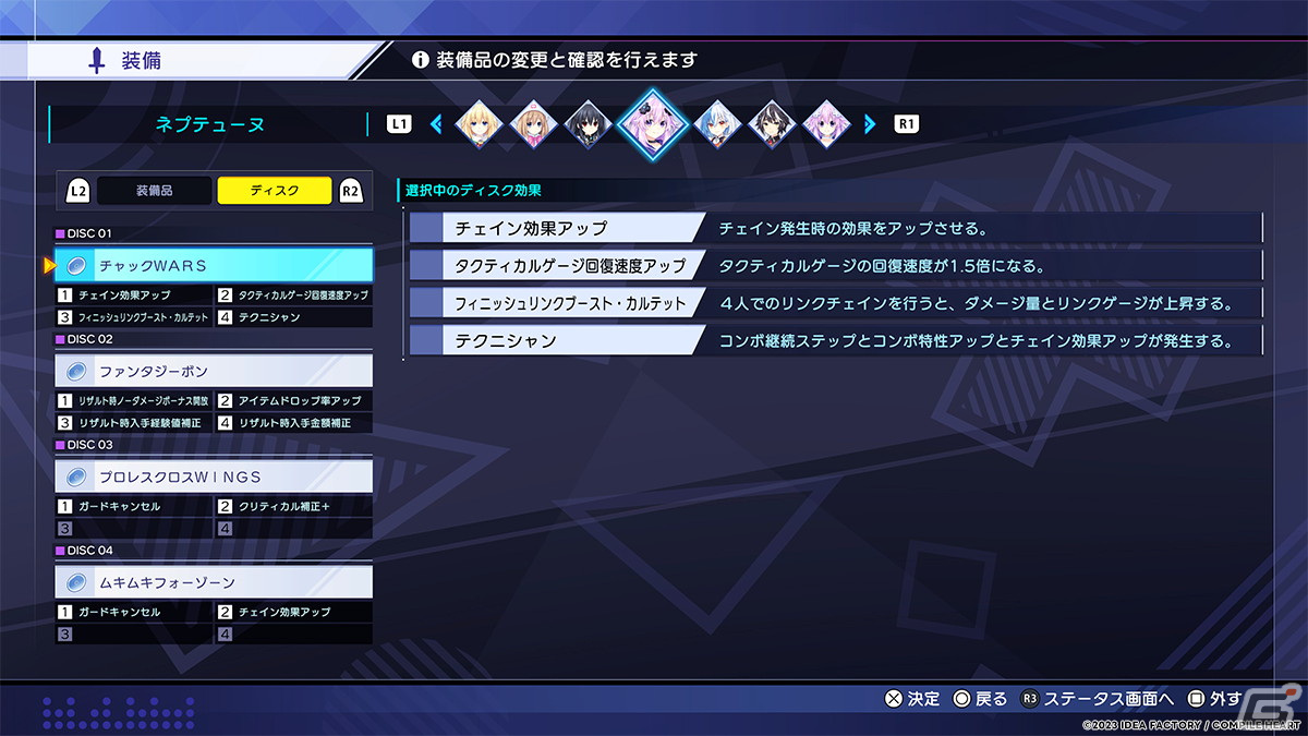 「ディスク」はキャラクターのカスタマイズ要素の一つです。「ダメージを無効化する“ジャストガード”を使用可能にする」等バトルシステムを拡張するものや、「入手経験値上昇」等キャラクターの成長自体に作用するものなど、装備することにより幅広い効果を発揮します。