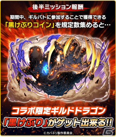 後半:期間中ギルドバトルに参加してもらえる「黒けぶりコイン」を規定数集める事で限定ギルドラ「黒けぶり」が獲得出来ます。