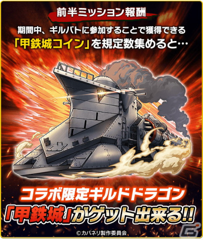 前半:期間中ギルドバトルに参加してもらえる「甲鉄城コイン」を規定数集める事で限定ギルドラ「甲鉄城」が獲得出来ます。
