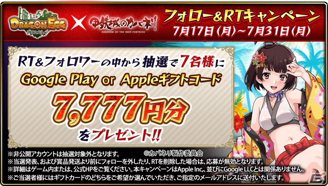 コラボを記念してTwitterでのリツイートキャンペーンを開催いたします。「ドラゴンエッグ」の公式Twitter「[公式]ドラゴンエッグ◎オムレット(@dragonegg_rudel)」をフォローし、キャンペーン対象ツイートをリツイートしていただくと、RT&フォローしていただいた方の中から抽選で、Google Play又はAppleギフトコード7,777円分をプレゼント!!