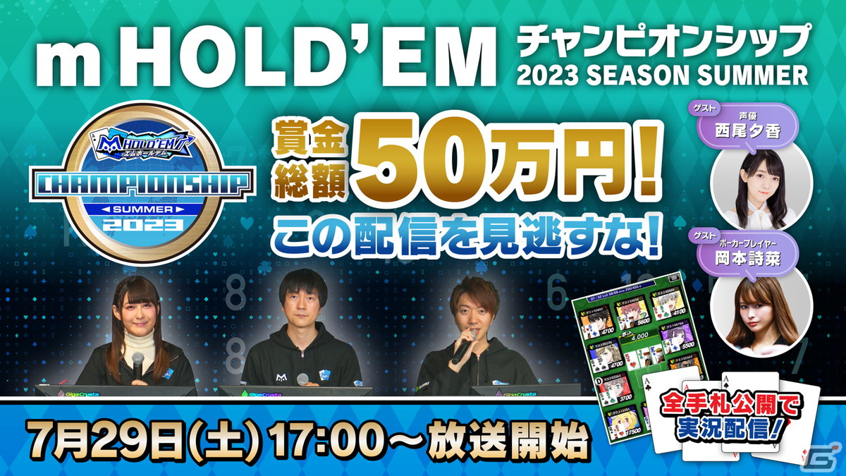 賞金総額50万円の「チャンピオンシップ2023 SEASON SUMMER」決勝大会の開催にあわせて、全プレイヤーのハンドが見える「観戦アプリ」を使用しての実況・解説付きの生配信が実施される。
