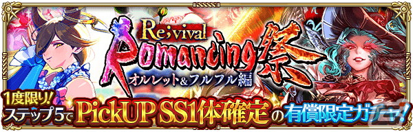 Romancing 祭限定スタイルの中から2つのスタイルが再登場&PickUPした「Romancing 祭 Re;vival オルレット&フルフル編」を開催いたします。本ガチャでは、通常ガチャと有償ジュエルで実行できるステップガチャの2種類があります。