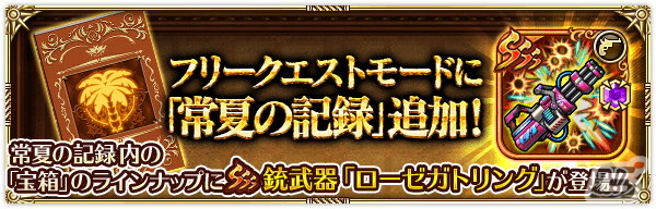 フリークエストモードに「常夏の記録」を追加しました。「常夏の記録」のステージクリアなどで得られる探索ポイントを集めて宝箱を開封していくと、SSS銃武器「ローゼガトリング」を獲得できます。また、毎日50回までは、クエストクリアで得られる探索ポイントが通常の20倍になります。