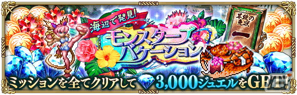 「常夏の記録」の特定のクエストに、8種類の特別なモンスターが稀に登場します。それらのモンスターを発見することでミッションクリアになり、全ミッションをクリアすると、3,000ジュエルなどの報酬が獲得できます。
