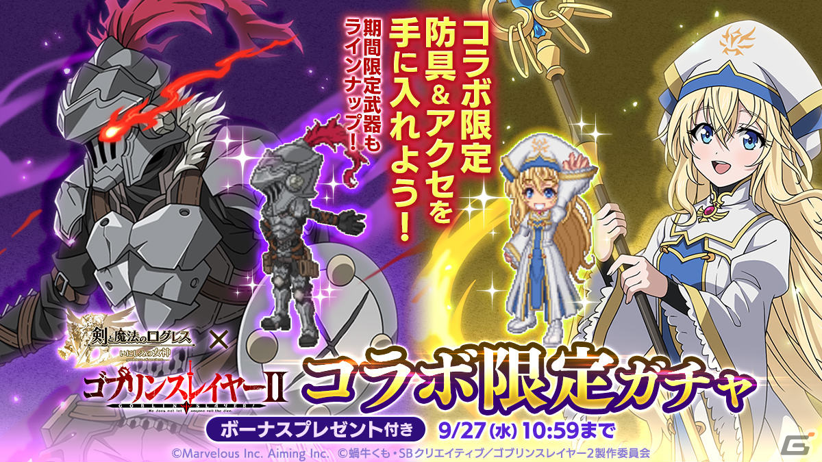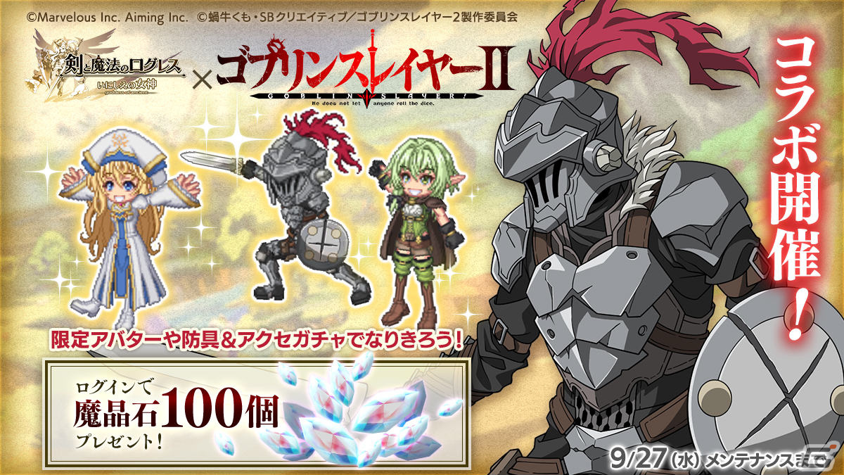 マーベラスは、iOS/Android向けアプリ「剣と魔法のログレス いにしえの女神」において、本日9月13日に「ゴブリンスレイヤーII」とのコラボレーションを含むアップデートを実施した。