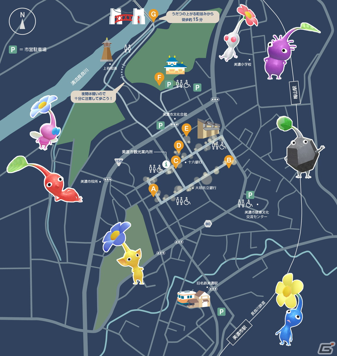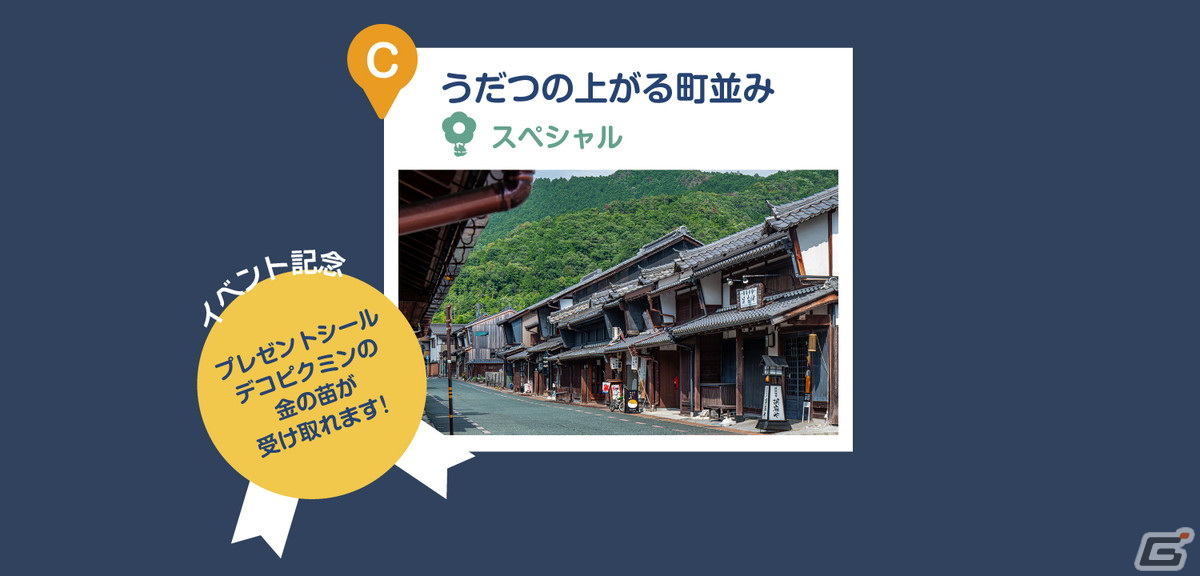 「美濃和紙あかりアート展」の会場である「うだつの上がる町並み」周辺に設置された7箇所のスペシャルスポットを訪れると、Pikmin Bloom(ピクミンブルーム)アプリ内でその場所にちなんだデコピクミンの金の苗を受け取ることができます。