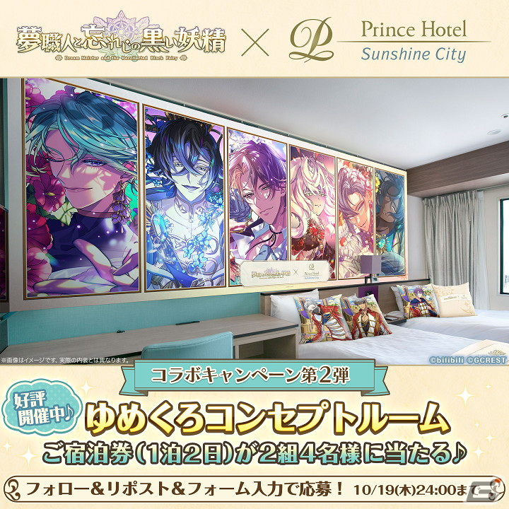 「ゆめくろ」公式X(旧Twitter/@yumekuro_info)とサンシャインシティプリンスホテル公式X(旧Twitter/@sunshinecityph)をフォローし、キャンペーンポストをリポストおよび「ゆめくろ」ゲームアプリ内の応募フォームに必要事項を入力で応募すると、抽選でコラボ企画へのご招待が当たります。